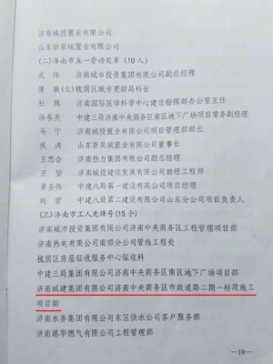 ??? 濟(jì)南市總工會近期下發(fā)“匠心繪藍(lán)圖,競賽促發(fā)展”主題活動獲獎名單,九分公司承建的濟(jì)南市中央商務(wù)區(qū)市政道路二期一標(biāo)段項目部獲得“濟(jì)南市工人先鋒號”榮譽(yù)稱號。