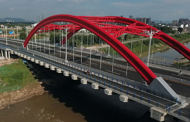 ??? 宣城宛陵路東段工程造價1.61億元,為城市主干路,全橋共計六聯(lián)18跨,其中主橋跨徑100米,采用下承式鋼管混凝土系桿拱橋。道路全長920米,紅線寬度56米,高架段路幅寬度31米(主橋38.2米)。