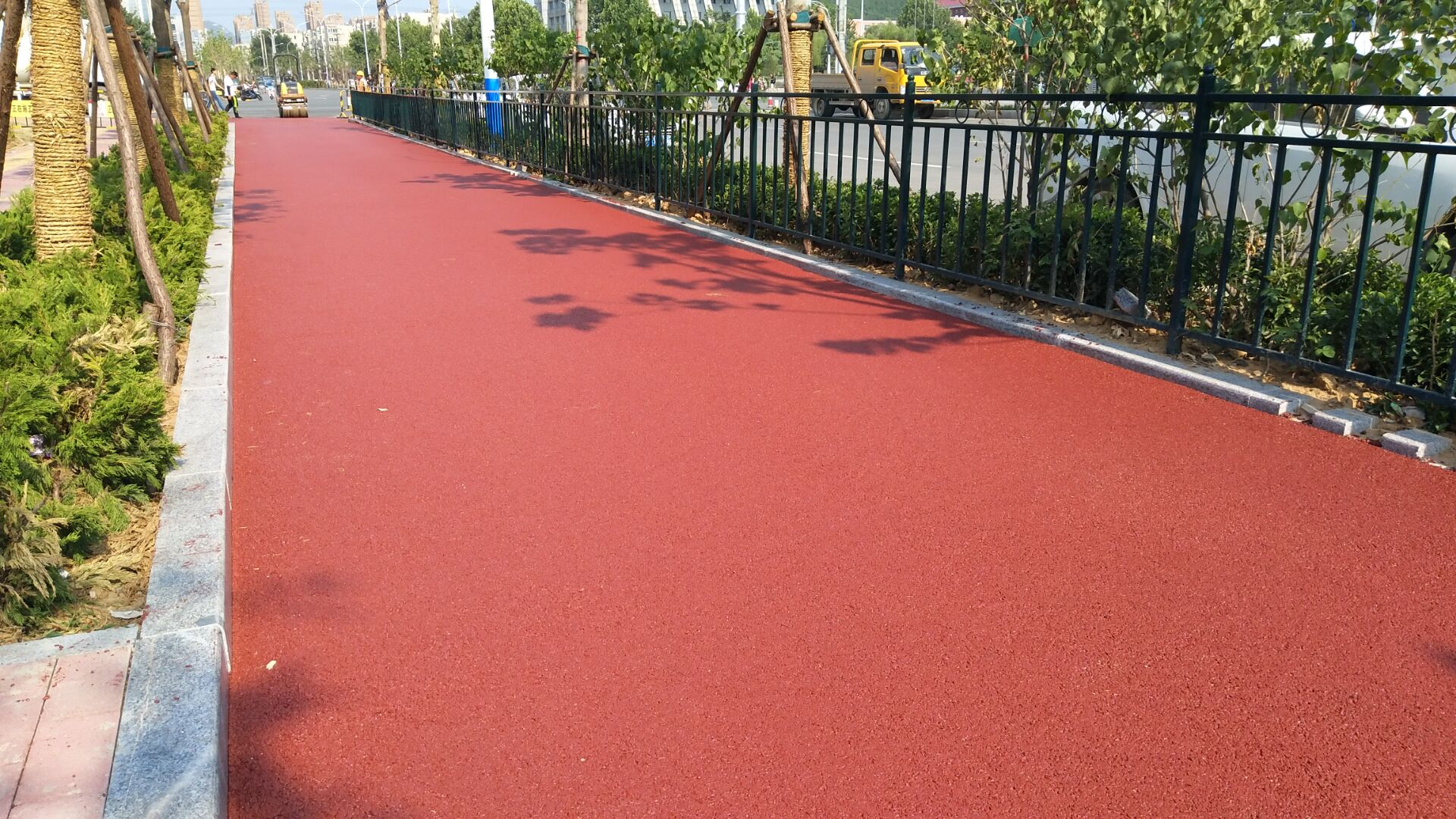 ??? 此次攤鋪施工為期4天,攤鋪面積1.5萬平方米,預(yù)計(jì)25日完成。攤鋪過程中,施工人員根據(jù)彩色瀝青的施工要求,特別注意施工過程的策劃和清潔控制,從出料、運(yùn)輸?shù)浆F(xiàn)場施工中的清潔處理都做了詳細(xì)的布置和要求,施工項(xiàng)目部與攤鋪項(xiàng)目部通力協(xié)作,密切配合,將保質(zhì)保量完成此次攤鋪任務(wù)。