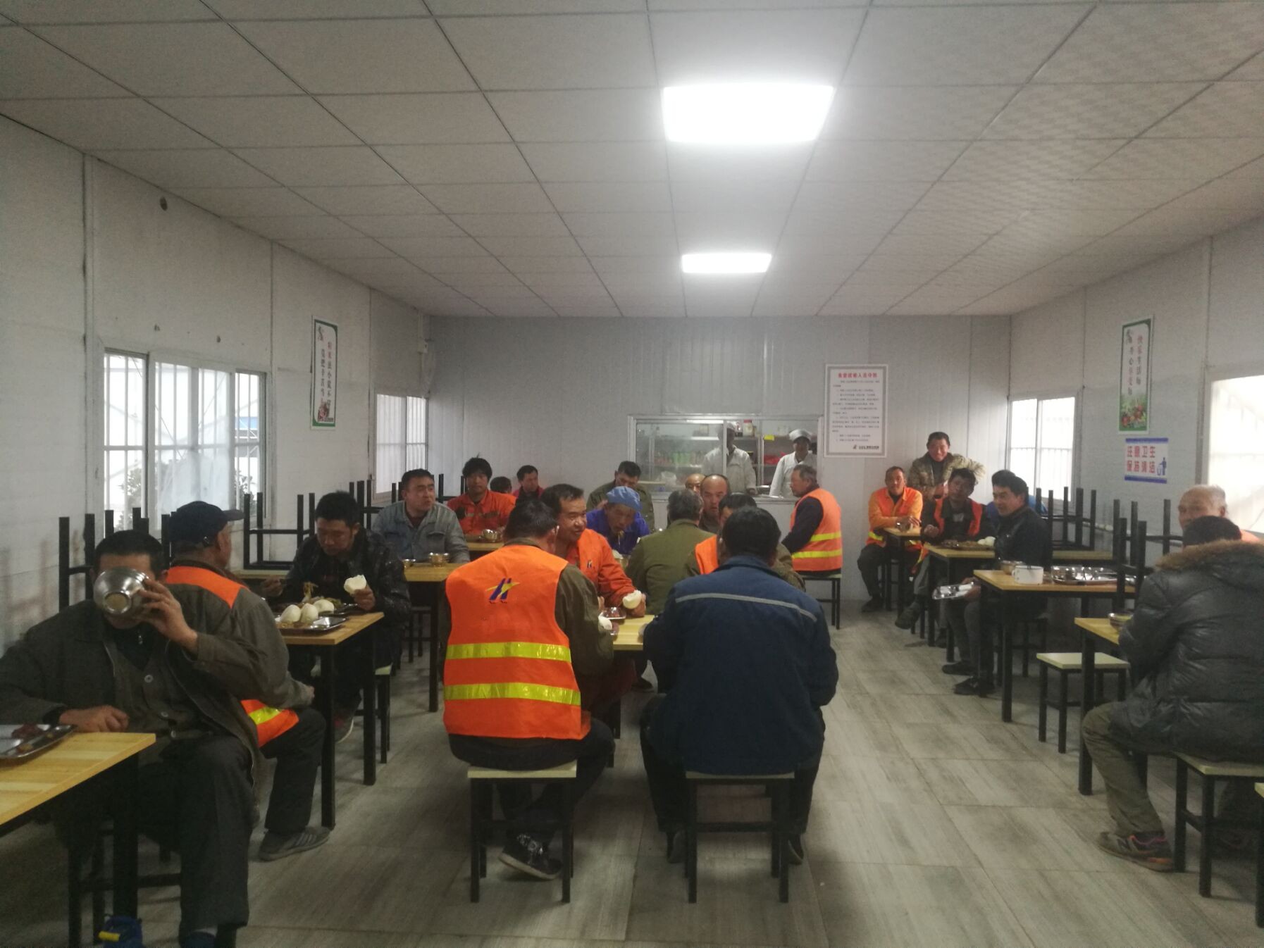 ??? 為提高勞務(wù)人員生活質(zhì)量,食堂內(nèi)統(tǒng)一配發(fā)飯卡,規(guī)定時(shí)間就餐。項(xiàng)目部外聘專業(yè)廚師,每餐保證四菜一湯,伙食質(zhì)量得到有效保障和改善,試行期間得到勞務(wù)人員的好評(píng),取得良好效果,也為安全標(biāo)桿項(xiàng)目部建設(shè)打下堅(jiān)實(shí)基礎(chǔ)。