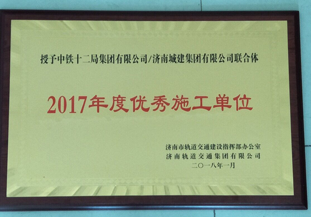 R3線土建五標濟南城建/中鐵十二局聯(lián)合體項目部榮獲濟南軌道交通集團有限公司“優(yōu)秀施工單位”榮譽稱號