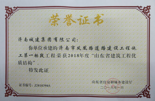 濟(jì)南市鳳凰路道路建設(shè)工程施工第一標(biāo)段工被評(píng)為2018年度“山東省建筑工程優(yōu)質(zhì)結(jié)構(gòu)”
