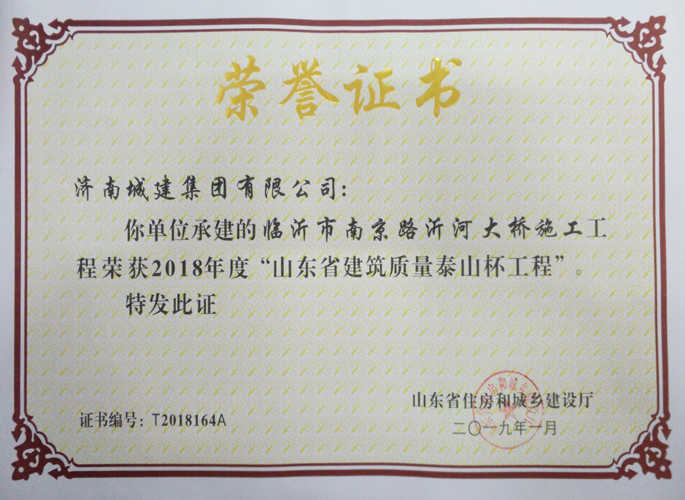 臨沂市南京路沂河大橋施工工程被評為2018年度“山東省建筑質(zhì)量泰山杯工程”