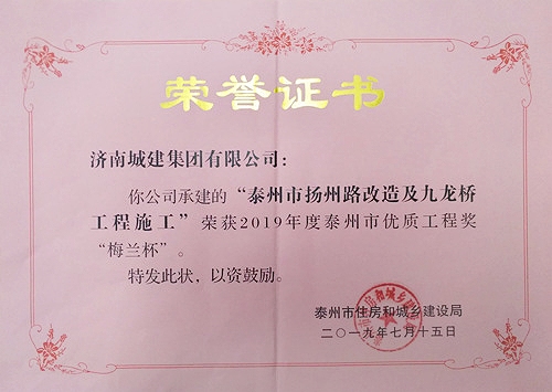 泰州市揚(yáng)州路及九龍橋工程施工被評(píng)為2019年度泰州市優(yōu)質(zhì)工程獎(jiǎng)”梅蘭杯“