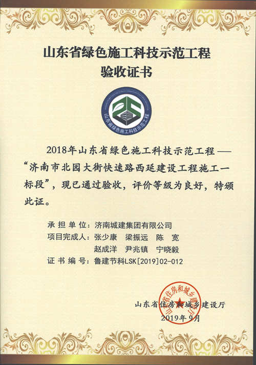 濟(jì)南市北園大街快速路西延建設(shè)工程施工一標(biāo)段被評(píng)為2018年山東省綠色施工科技示范工程