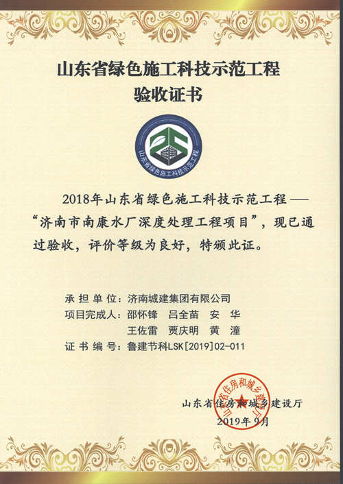 濟(jì)南市南康水廠深度處理工程項(xiàng)目被評(píng)為2018年山東省綠色施工科技示范工程