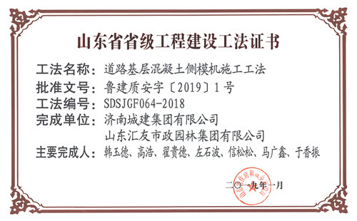 集團“道路基層混凝土側(cè)模機施工工法”被評為山東省省級工程建設(shè)工法