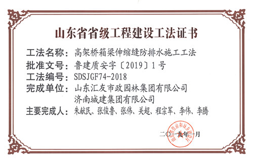 集團“高架橋箱梁伸縮縫防排水施工工法”被評為山東省省級工程建設(shè)工法