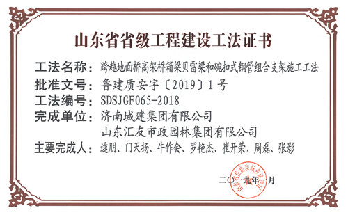集團(tuán)“跨越地面橋高架橋箱梁貝雷梁和碗扣式鋼管組合支架施工工法”被評(píng)為山東省省級(jí)工程建設(shè)工法
