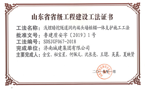 集團(tuán)“淺埋暗挖隧道洞內(nèi)端頭墻樁錨一體支護(hù)施工工法”被評(píng)為山東省省級(jí)工程建設(shè)工法