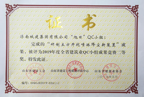 集團(tuán)”旭日“QC小組完成的《研制土方開挖噴漆降塵新裝置》成果被評(píng)為“2019年度全省建筑業(yè)QC小組成果競賽二等獎(jiǎng)