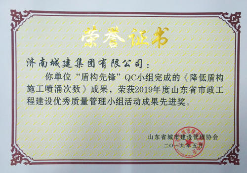 集團(tuán)“盾構(gòu)先鋒”QC小組完成的《降低盾構(gòu)施工噴涌次數(shù)》成果榮獲“2019年度山東省市政工程建設(shè)優(yōu)秀質(zhì)量管理小組活動(dòng)成果先進(jìn)獎(jiǎng)