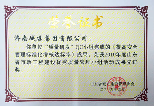 集團(tuán)“質(zhì)量研發(fā)”QC小組完成的《提高安全管理標(biāo)準(zhǔn)化考核達(dá)標(biāo)率》成果榮獲“2019年度山東省市政工程建設(shè)優(yōu)秀質(zhì)量管理小組活動(dòng)成果先進(jìn)獎(jiǎng)