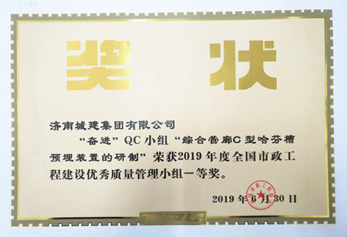 集團(tuán)“奮進(jìn)”QC小《綜合管廊C型哈芬槽預(yù)埋裝置的研制》榮獲“2019年度全國市政工程建設(shè)優(yōu)秀質(zhì)量管理小組一等獎”