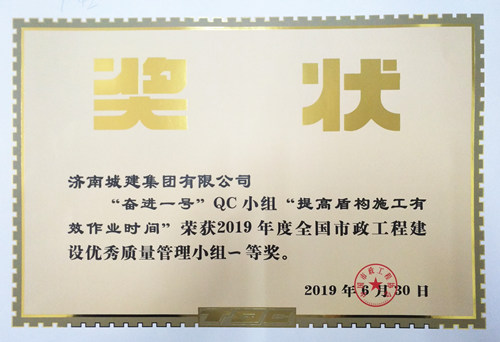 集團(tuán)“奮進(jìn)一號(hào)”QC小組《提高盾構(gòu)施工有效作業(yè)時(shí)間》榮獲“2019年度全國市政工程建設(shè)優(yōu)秀質(zhì)量管理小組一等獎(jiǎng)”