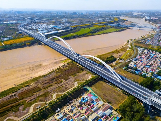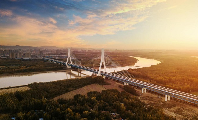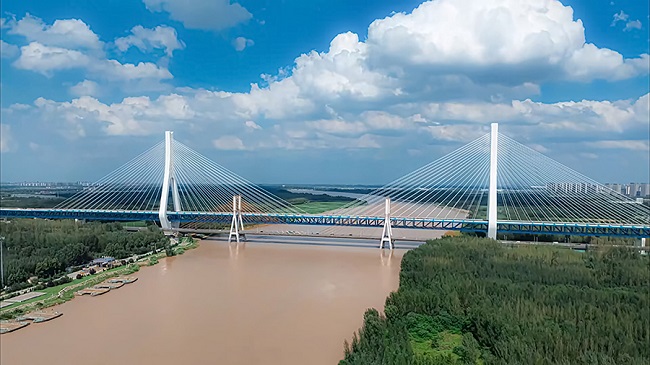項(xiàng)目全長6.74公里,包括特大橋2座(跨黃河特大橋長2520米,跨濟(jì)廣高速特大橋長1066米)、中小橋3座,涵洞12道,平面交叉15處,分離式立交1處,互通式立交1處。跨黃河主橋及引橋段中部同步建設(shè)必要預(yù)留的軌道交通橋梁工程。