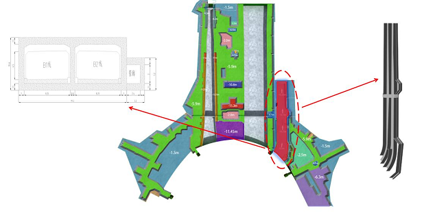 8號下穿通道位于T1航站樓西北側,南北向橫穿正在建設的濟南遙墻機場T2航站樓,連接南、北工作區(qū),可以實現(xiàn)工作區(qū)車輛的南北街接。8號下穿通道全長245米,采用雙倉分建和雙倉共建鋼筋混凝土結構,雙倉分建段尺寸標準段內徑凈寬8.25米,凈高約7.2~7.5米,底板厚度1.2米,頂板厚度0.7米,中墻厚0.8米,側墻厚1.0米。8-1通道主體涉及高支模超危大工程,墻體厚、高度寬度均漸變、圓弧線性,橫穿8條斜交梁,多處異型柱,與中建三局八局預留預埋交叉施工,結構復雜,施工難度大。自項目啟動以來,項目部秉持著精益求精的態(tài)度,克服困難,順利完成8號下穿通道首段主體澆筑節(jié)點目標。