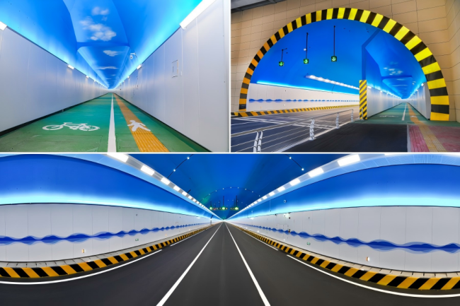 春喧路道路建設(shè)工程全長(zhǎng)1620米,其中玉皇山隧道長(zhǎng)1150米,單洞斷面寬度19.8米、高度13.6米,快車(chē)道11米,行人及非機(jī)動(dòng)車(chē)道4米。玉皇山隧道斷面采用左右線分離雙洞形式,每洞設(shè)置中隔墻,將機(jī)動(dòng)車(chē)道與人非通道徹底隔離,形成獨(dú)立車(chē)行和慢行孔洞,確保行人通行安全。隧道南口設(shè)置聲屏障,有效降低行車(chē)噪音對(duì)周邊居民小區(qū)、學(xué)校的影響。隧道北洞口采用彩繪施工工藝,與周?chē)h(huán)境融為一體,整體意境深遠(yuǎn),形成虛實(shí)對(duì)比。隧道內(nèi)以“山水泉城”為主題,設(shè)置泉城特色星空頂、藍(lán)天白云噴繪,極大提升整體觀感和行車(chē)舒適度。