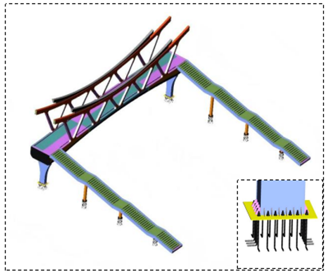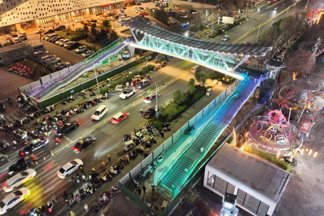 印象濟南·泉世界作為濟南西部重要的文旅商業(yè)綜合體,長期面臨人車交織的通行壓力與安全隱患。本次建設(shè)的天橋全長47.3米,橋面寬5米,以“雄鷹展翅”為造型,將橋體結(jié)構(gòu)、材質(zhì)、色彩進行巧妙融合,實現(xiàn)人車分流、保障通行安全,成為串聯(lián)不同風(fēng)貌街區(qū)的景觀紐帶。該項目直面商圈出行痛點,選址于人流密集區(qū)域,南北雙側(cè)配備梯道與垂直電梯,全面貫徹全齡友好、無障礙通行理念,全力打造一座讓市民安心、讓城市暖心的“連心橋”。