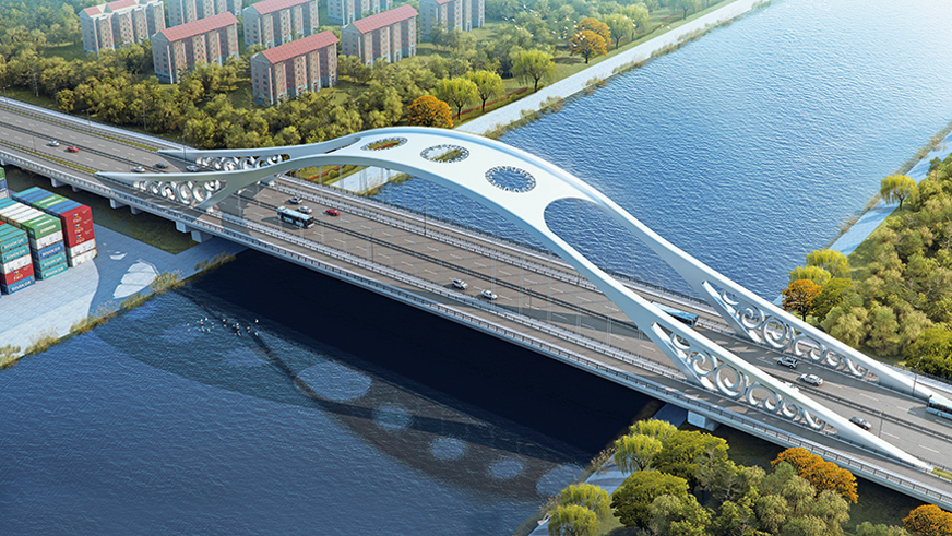 濟(jì)南齊魯大道項目全長 6735 米,其中引橋長 5565 米,跨黃河主橋長度 1170 米,主跨 420 米。是世界上最大跨徑、最大梁寬、最高預(yù)應(yīng)力拉索的下承式網(wǎng)狀系桿拱橋。